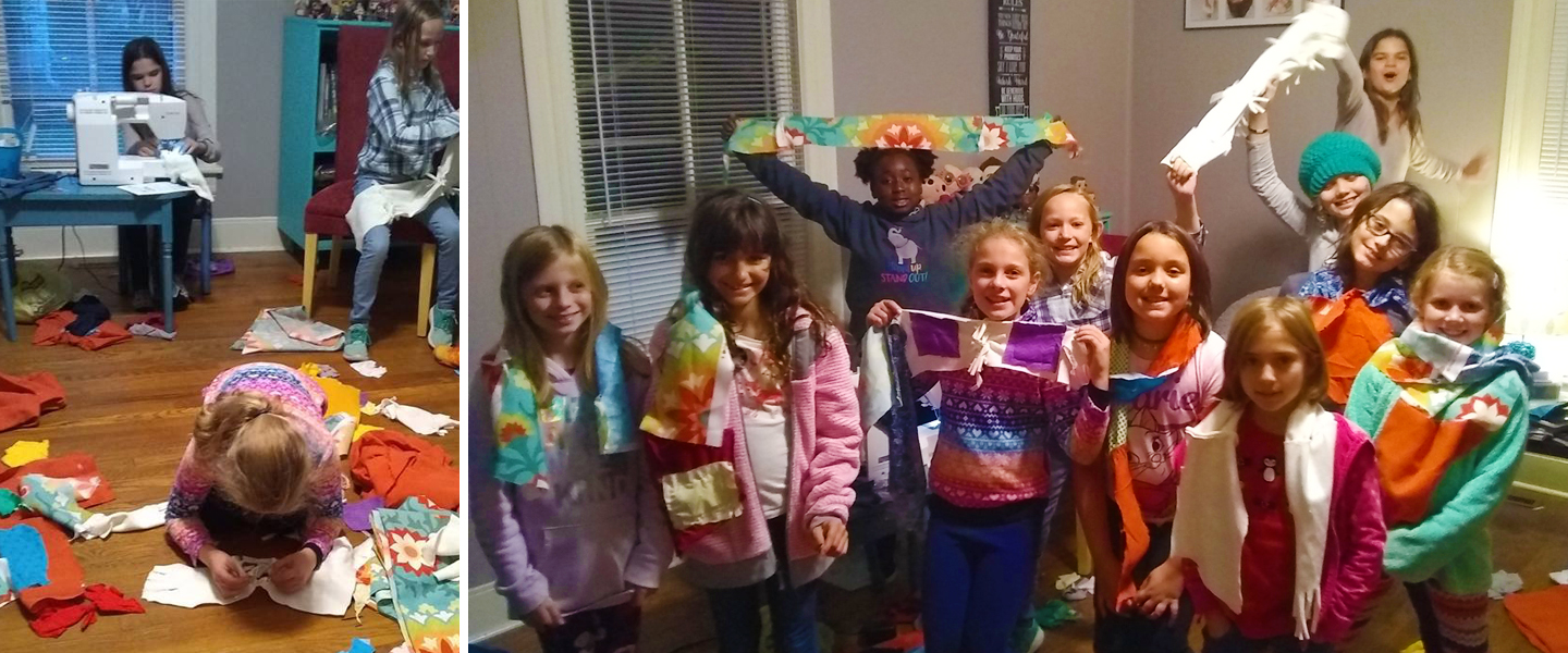 Girl Scout Junior Troop 2983 held a service night to make scarves for the homeless in the Greensboro area. The girls used their sewing and knotting skills they had learned during past troop meetings to make the scarves.