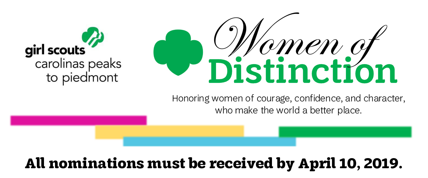 Girl Scouts Carolinas Peaks to Piedmont is excited to announce our annual Women of Distinction awards, recognizing women leaders in our local communities. We are currently accepting nominations for these prestigious awards. Please refer to the nomination form for nomination criteria. You can find the nomination form here. The nomination deadline is April 1, 2019.
