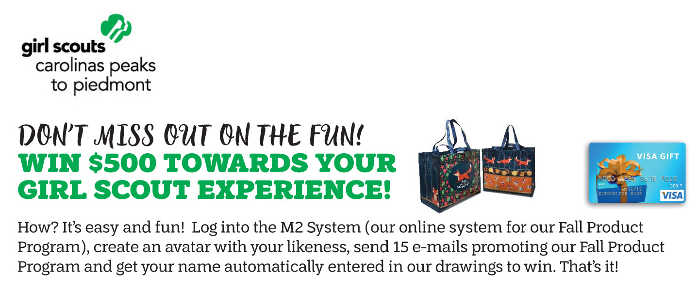 How? It’s easy and fun! Log into the M2 System (our online system for our Fall Product Program), create an avatar with your likeness, send 15 e-mails promoting our Fall Product Program and get your name automatically entered in our drawings to win. Increase your chances of winning the grand prize (a $500 VISA gift card towards your Girl Scout experience) by completing the bonus steps for extra entries into the grand prize drawing.
