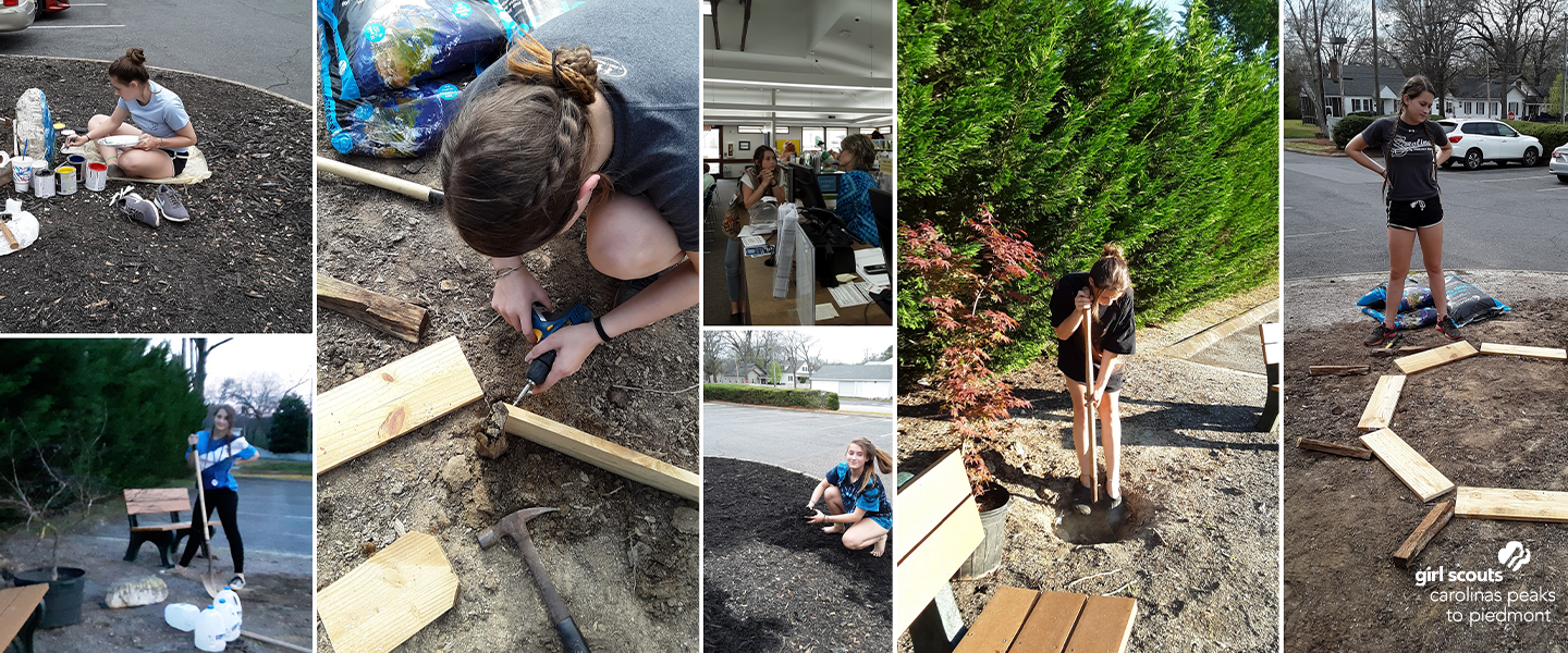 Congratulations to Eli-za White from Girl Scout Troop 2286 of Cleveland County for earning her Girl Scout Silver Award! She worked with York County Library and Friends of the Library to turn an empty plot at the library into a beautiful garden in early 2020. Her experience earning her Girl Scout Bronze Award in 2017 helped her feel prepared for the project. Despite one of the trees from her garden being stolen twice, she worked hard to make a serene outdoor reading area. Her patience and persistence was worth it, and she completed the garden with donated benches, a bird feeder, a painted rock and a raised flower bed. She planted bulbs, perennials and a Japanese Maple (three times) to ensure the garden will remain verdant for years to come.