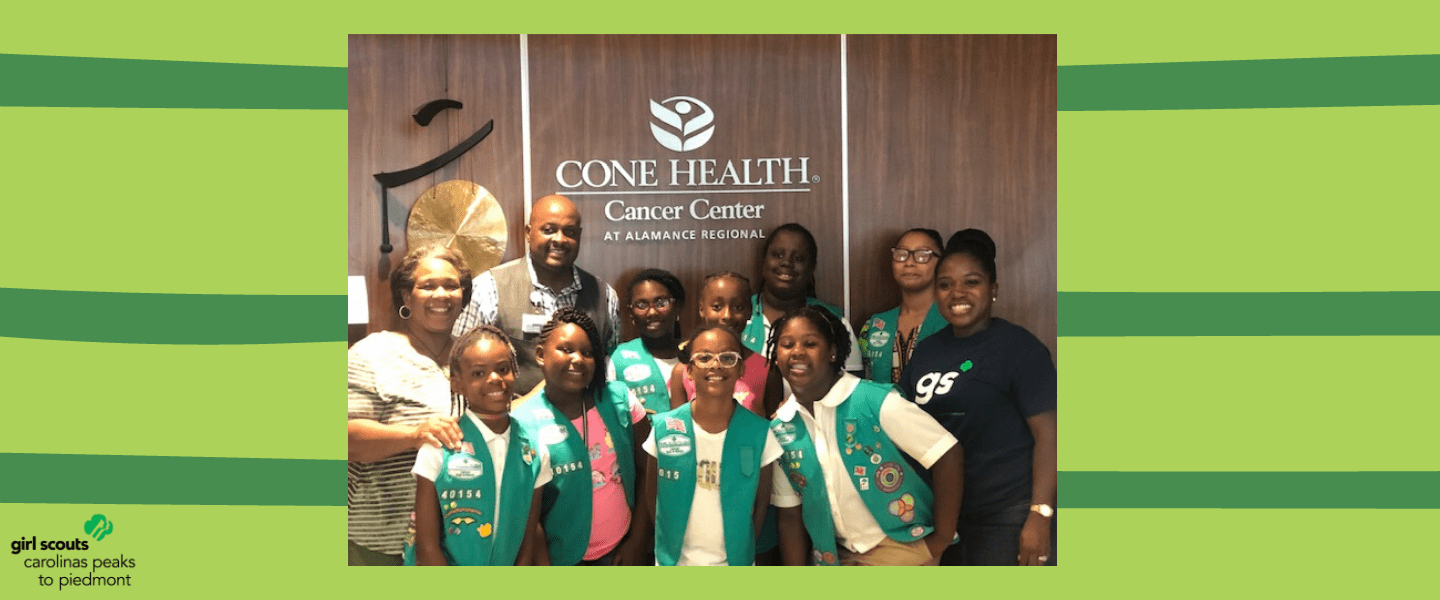 Congratulations to Maya, Aliana, Megan, Naomi, Taylor, JaNiya, Kadence, Sa’Myah, Gavrielle, Amaris, Amira, Kaleyana, Camille and Jada from Girl Scout Troop 40514 of Guilford County on earning their Girl Scout Bronze Award earlier this year! After making the initial decision to support cancer patients at their local hospital, the troop researched and learned about the different forms of cancer, their effects and the treatments available. The girls invited employees of cancer networks, as well as cancer patients, to talk to them about the disease. The troop designed bandanas and hats to give to cancer patients that would encourage them during their treatment and held a canned food drive–thru, collecting $350 worth of food for the Cancer Center’s food pantry. Through their project, the girls learned not only about the importance of living fully, but about being mindful and compassionate about other individual’s situations.