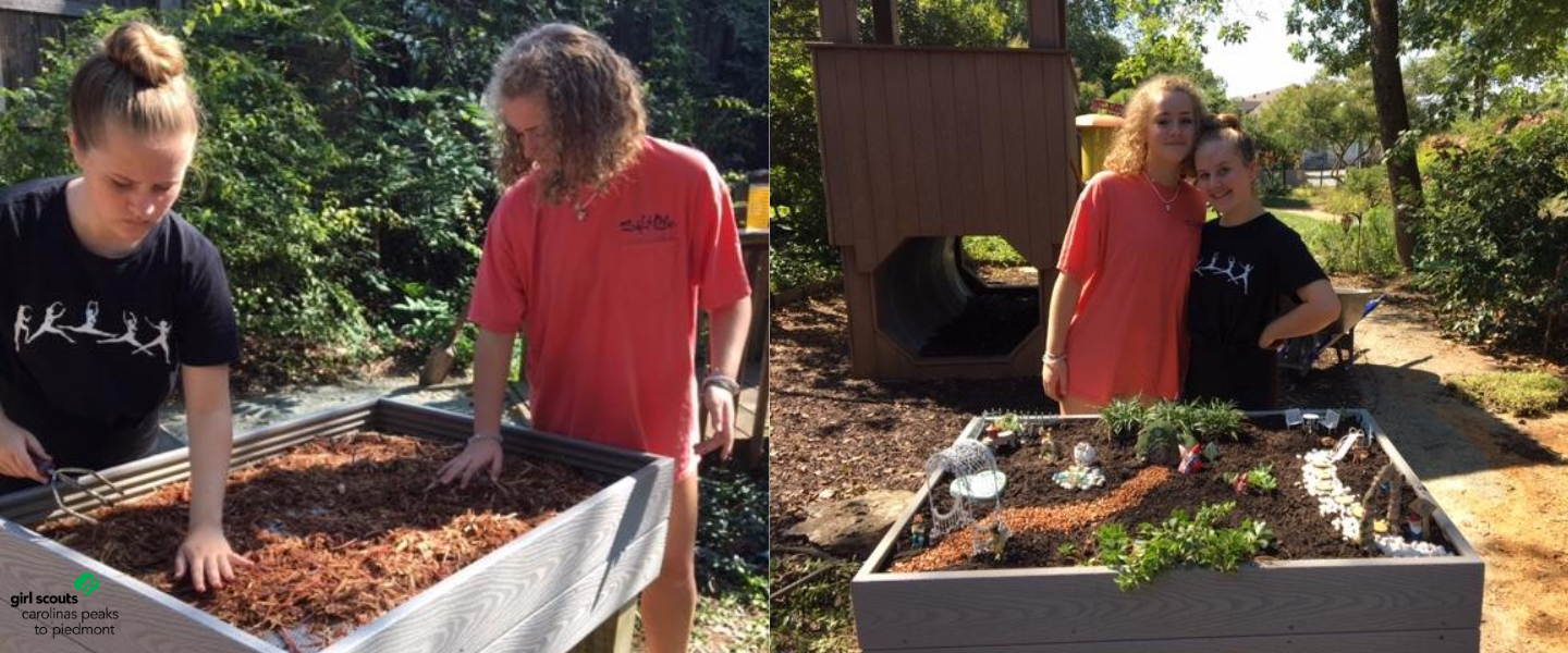 Congratulations to Ali and Meredith From Troop 2040 of Guilford County on earning their Girl Scout Silver Award earlier this year! For their project “Fairies and Food,” Ali and Meredith worked closely with the Kids Path Hospice and Palliative Care of Greensboro to update a part of their outdoor space that was in desperate need of repair, and also to provide meals to the families of children in care at the organization. The girls spent most of their time working on the fairy garden, constructing, designing and completing the space on their own! Though they struggled with communication, finding time to make their project happen and working around specific guidelines and other roadblocks, Ali and Meredith were able to finish a beautiful fairy garden for the patients and provided several freezable and easy-to-prepare meals for families, as well as learned valuable leadership and professional skills along the way!