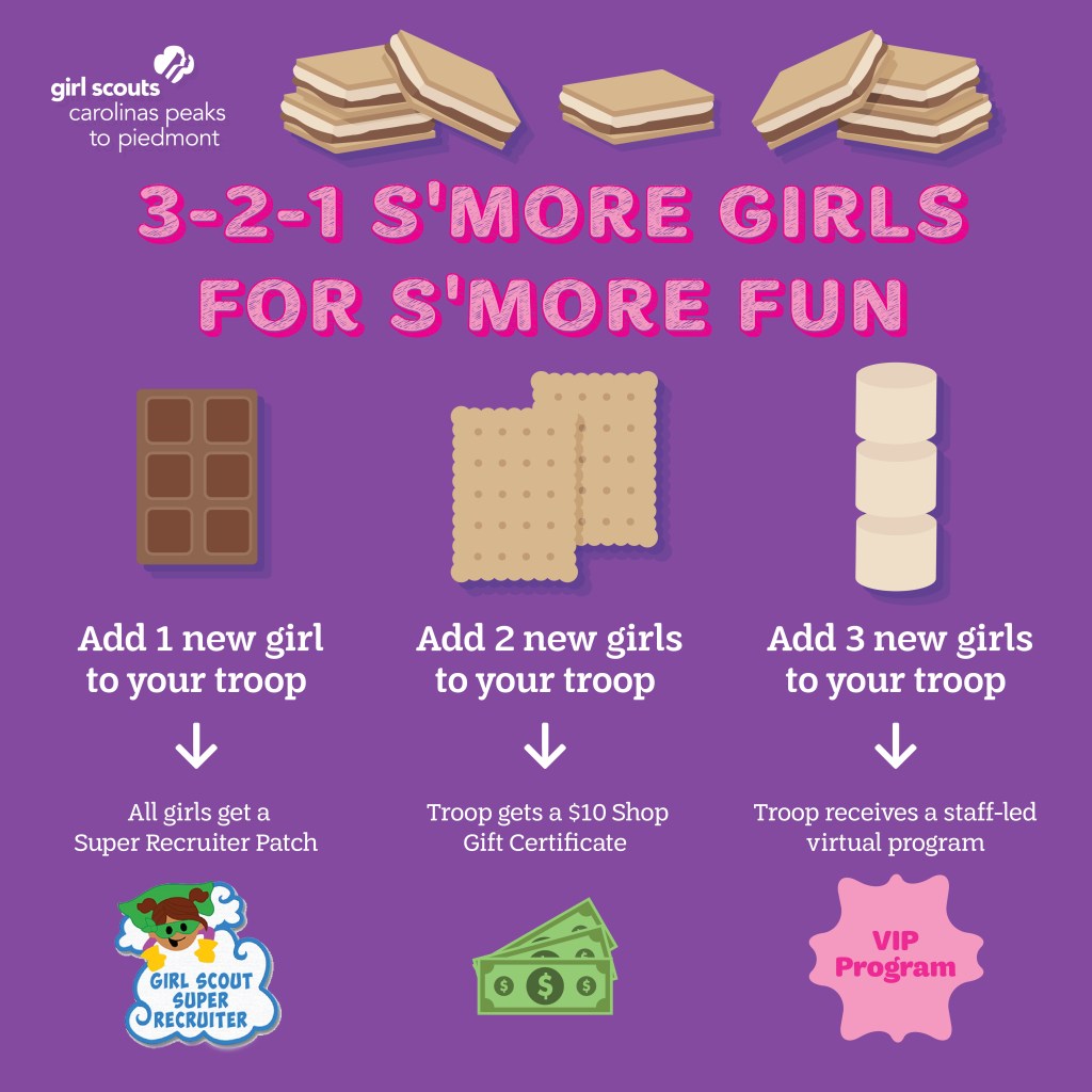 Our goal is to support the troops in our council and to enhance the Girl Scout experience for ALL girls. Active troops and good troop leaders are keys to a successful experience. With that in mind, we’d like to issue a S’more Girls Challenge to our troops!