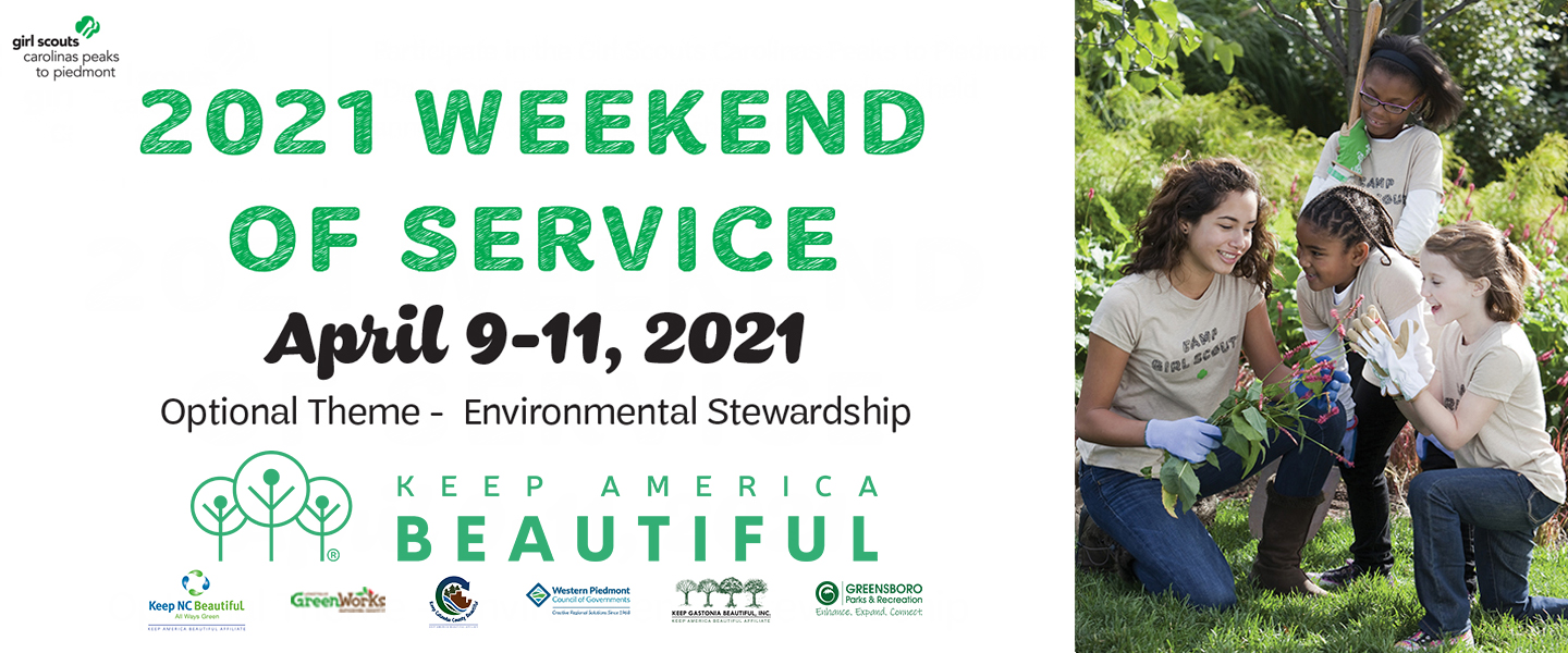 Every spring, Girl Scouts Carolinas Peaks to Piedmont hosts its Weekend of Service, where we encourage all our girls, volunteers and families to do a good turn for someone. The 2021 Weekend of Service will take place April 9-11, 2021, with an emphasis on environmental stewardship. Our goal this year is to have 300 people participate- so get your projects ready!