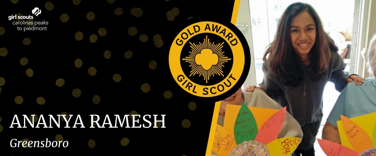 Girl Scouts Carolinas Peaks to Piedmont is pleased to announce that Ananya Ramesh, Greensboro, has earned her Girl Scout Gold Award, the highest award in Girl Scouting.