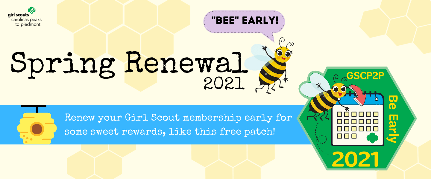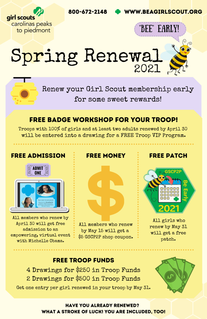 Spring Renewal is happening now! Renewing your membership now gives you the opportunity to earn some great incentives, including an invitation to a virtual event featuring Michelle Obama and the chance to win some troop funds.