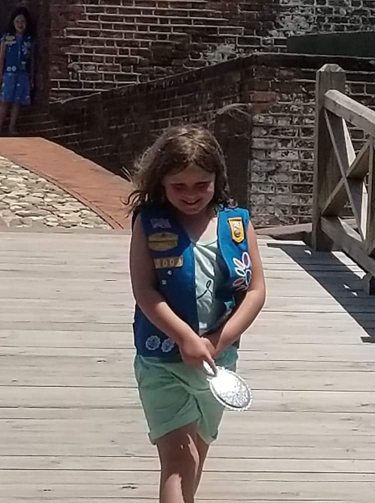 My favorite Girl Scout memory was our beach trip with our Girl Scout troop several years ago. As Daisies, we worked hard to earn money for this trip by selling cookies. We earned enough money to pay for a weekend trip to the beach for each of the families in our troop. When we got to the hotel, we all got our sand buckets from our troop leader filled with goodies and fun activities for the weekend. We made tie dye shirts and socks, cooked dinner with our parents, made S.W.A.P.S. and played a lot of games together. On Saturday, we even had a beach clean up where each girl had to fill their bucket with trash from the beach. The most memorable part of all was when we got to do our bridging ceremony from Daisies to Brownies at Fort Macon. It was cool to get to walk over the bridge and see our parents proudly waiting for us on the other side. Many people stopped by to witness our bridging program inside of the fort and applauded us. We ended the trip by enjoying delicious cupcakes with sour rainbows on top. I will never forget how much fun we had with our Girl Scout sisters/friends. – Audrey Brehm, Girl Scout Junior