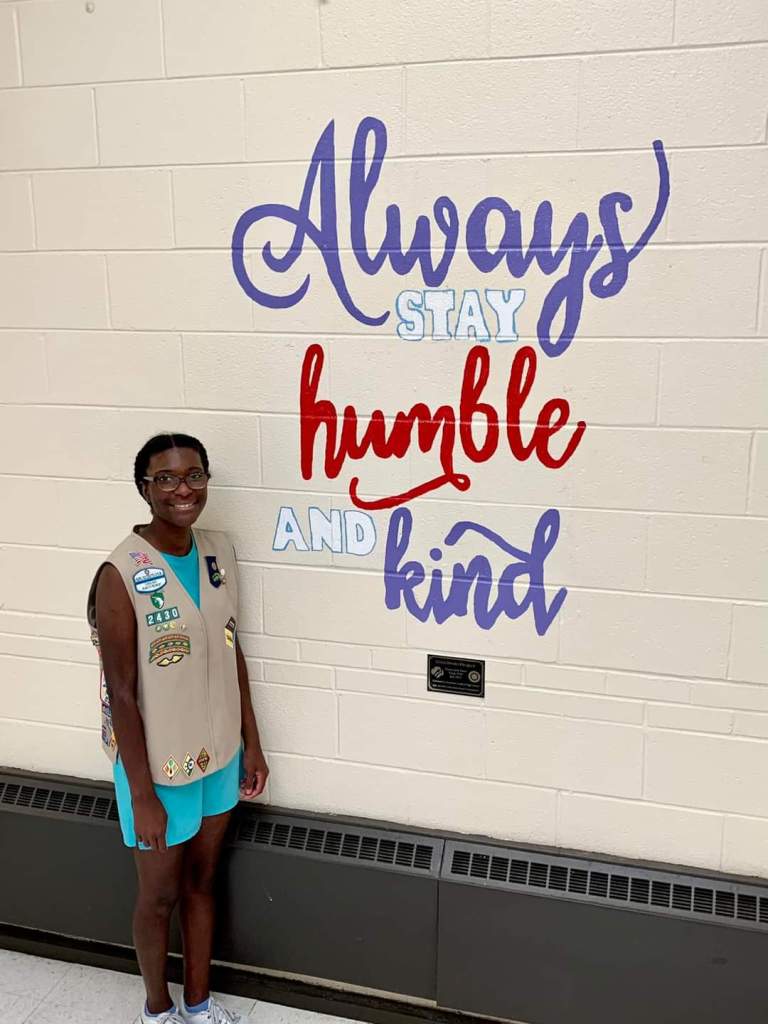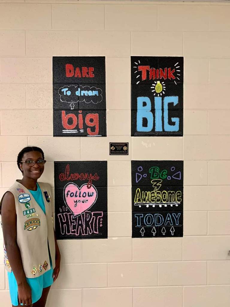 Davis, a member of Girl Scout Troop 2430, created five murals and two acts of kindness bulletin boards at Southwest Guilford High School. The bulletin boards, one for students and one for staff, is a place where people can leave inspirational quotes or give advice or motivation to those who need it. The murals also serve as a pick-me-up to encourage students throughout the day.