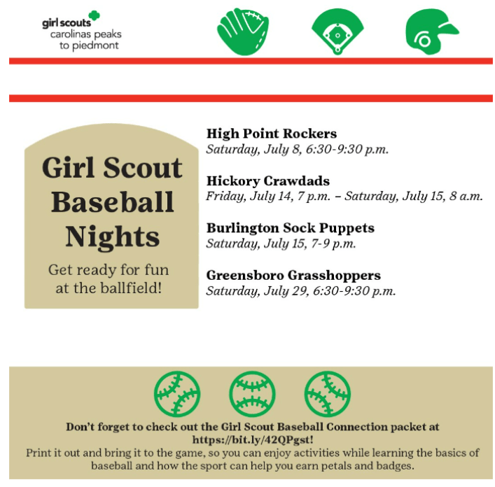 There is only a few more chances to join us for Girl Scout Night at the Ballpark! Don’t forget that we also have this great Baseball Connection resource– letting you have fun at the game while learning how you can also earn badges while there!