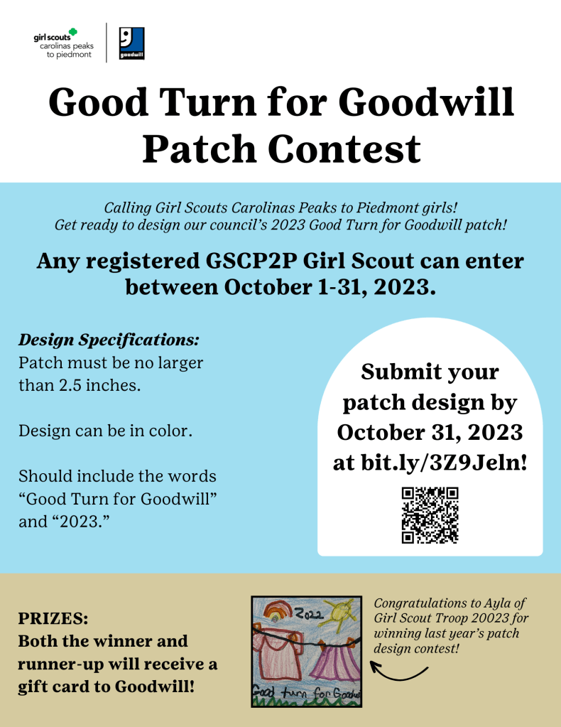 Every October, Girl Scouts Carolinas Peaks to Piedmont and Goodwill Industries partner together to kick off the annual Good Turn for Goodwill service project. This service project teaches girls about Goodwill’s employment and training programs and how the donations they give to the organization help to support these efforts.