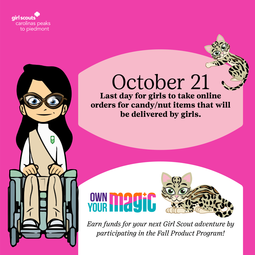 This upcoming Saturday, October 21 is the last day girls can take online orders for candy and nut items that will be delivered in-person by the girl.