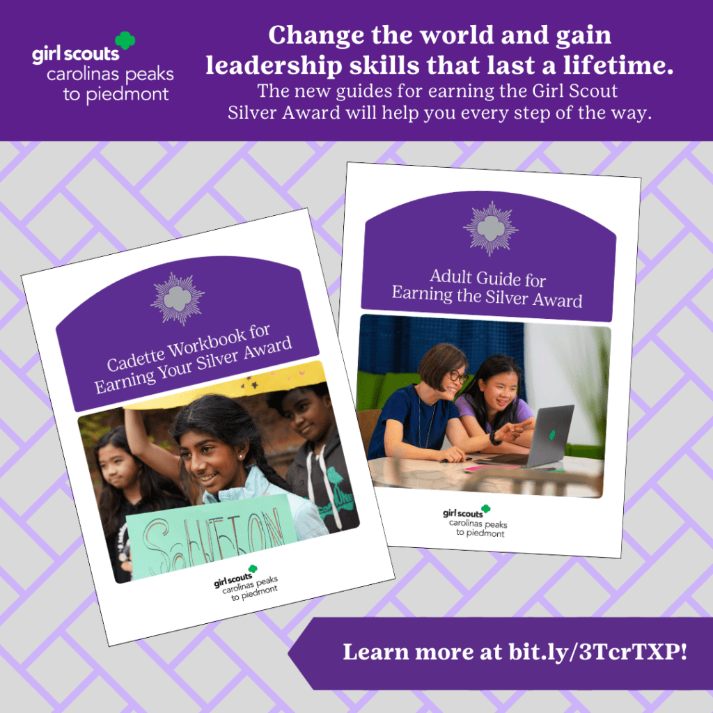 Girl Scout Cadettes can earn the Girl Scout Silver Award by tackling an issue they’re passionate about, all while making a difference and learning leadership skills that will last them a lifetime. New step-by-step guides have been recently updated and are now available on our website, making it even easier to navigate the Silver Award process.