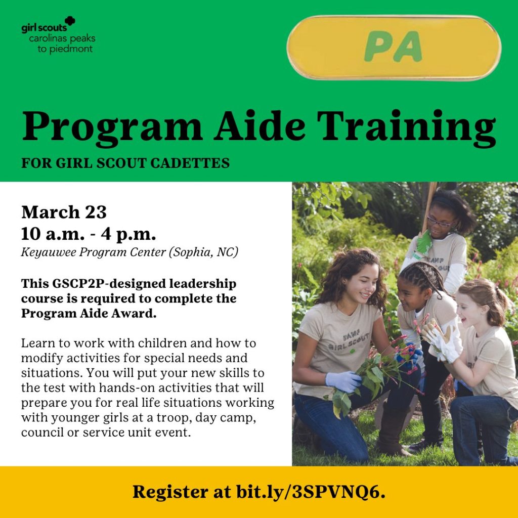 Do you have Girl Scout Cadettes who are interested in earning the Program Aide Award? On Saturday, March 23 at Keyauwee Program Center, Program Aide Training is being offered. This training gives girls hands-on activities to teach them how to work with younger girls in a variety of settings. The registration deadline is this Thursday, March 14.
