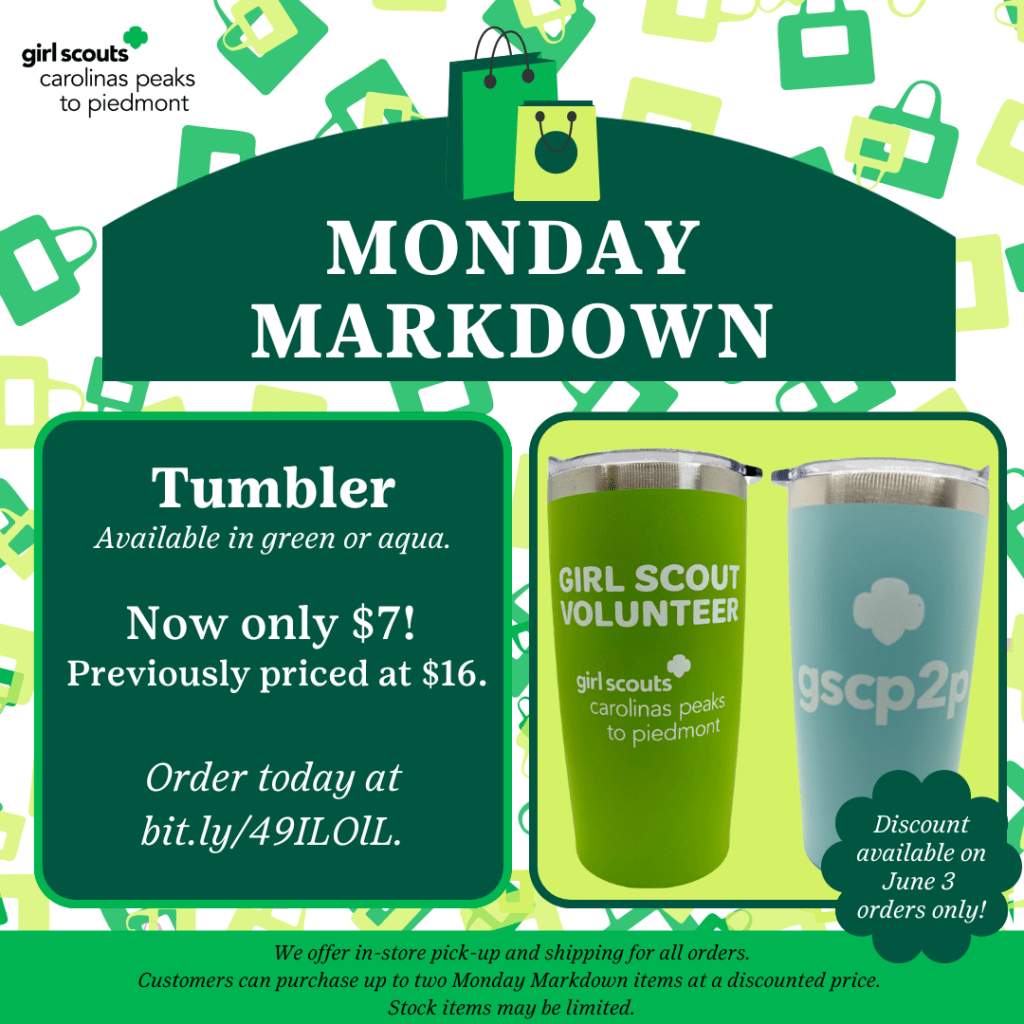 We are excited to announce that our Girl Scout Shops will be offering a special discount on a featured item every Monday! Find a featured item at a discounted price every Monday by tuning into our social media pages or checking our Today’s Tips newsletter. You can come to any of our shop locations or place an order using our shop order form (you can select in-store pick-up or shipping). Customers can purchase up to two Monday Markdown items at a discounted price, but stock items may be limited.