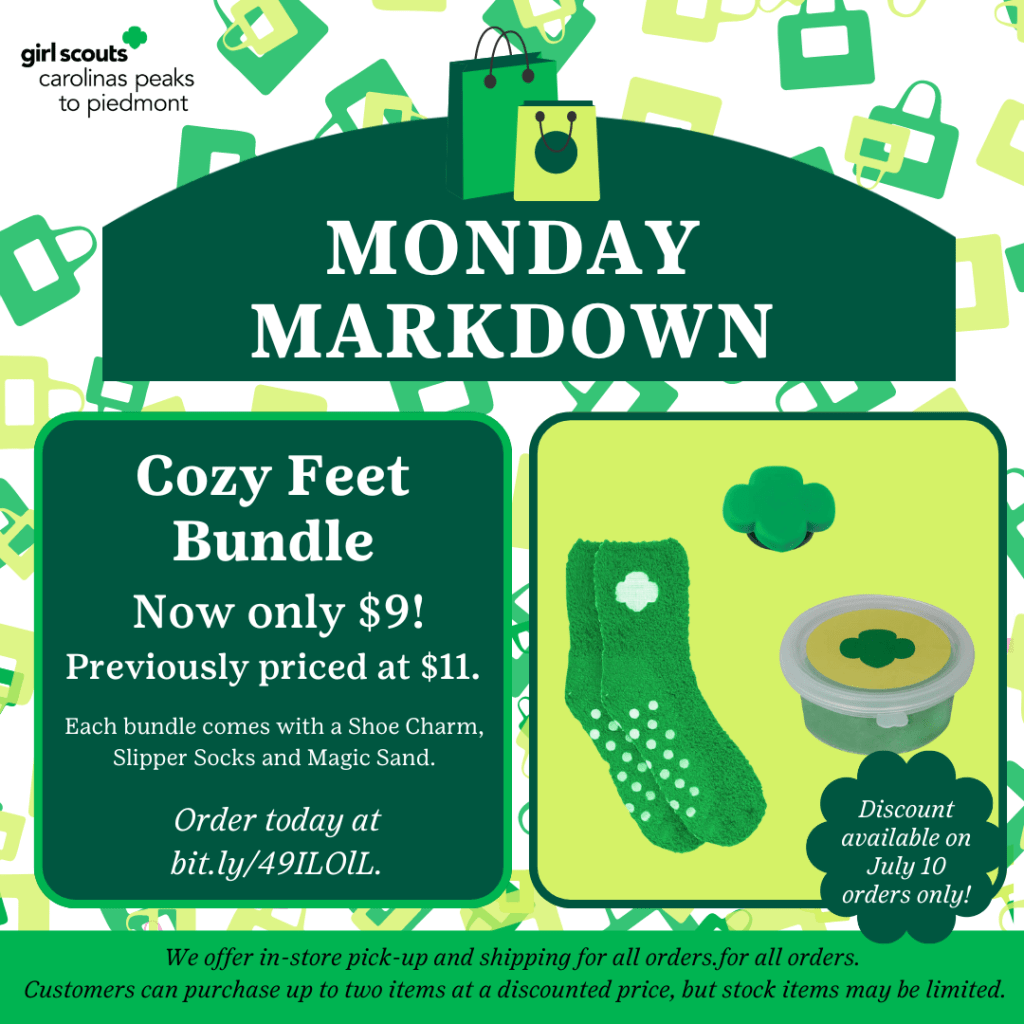 Our Girl Scout Shops are offering a special discount on a featured item every Monday! Find a featured item at a discounted price every Monday by tuning into our social media pages or checking our Today’s Tips newsletter. You can come to any of our shop locations or place an order using our shop order form (you can select in-store pick-up or shipping).