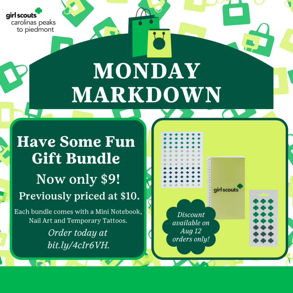 Our Girl Scout Shops are offering a special discount on a featured item every Monday! You can come to any of our shop locations or place an order using our shop order form (you can select in-store pick-up or shipping).