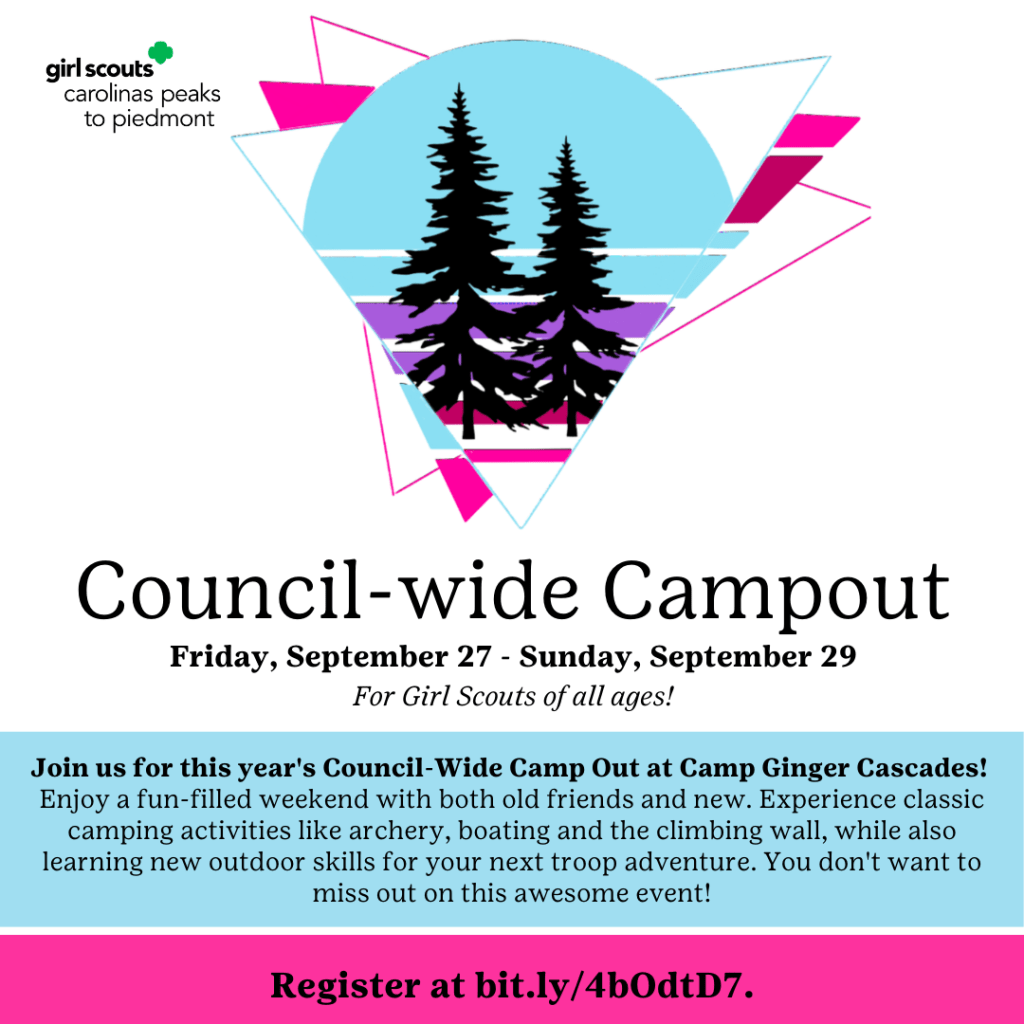 Join us for this year’s Council-Wide Camp Out at Camp Ginger Cascades on September 27-29! Enjoy a fun-filled weekend with both old friends and new. Experience classic camping activities like archery, boating and the climbing wall, while also learning new outdoor skills for your next troop adventure. The weekend includes all meals and snacks on Saturday and breakfast on Sunday. Additionally, your admission to the GSCP2P 15th Birthday Bash on Saturday evening is included. Don’t miss out on this unforgettable weekend of adventure and celebration! Please note that this is not a drop-off event; all campers must be accompanied by proper adult supervision.