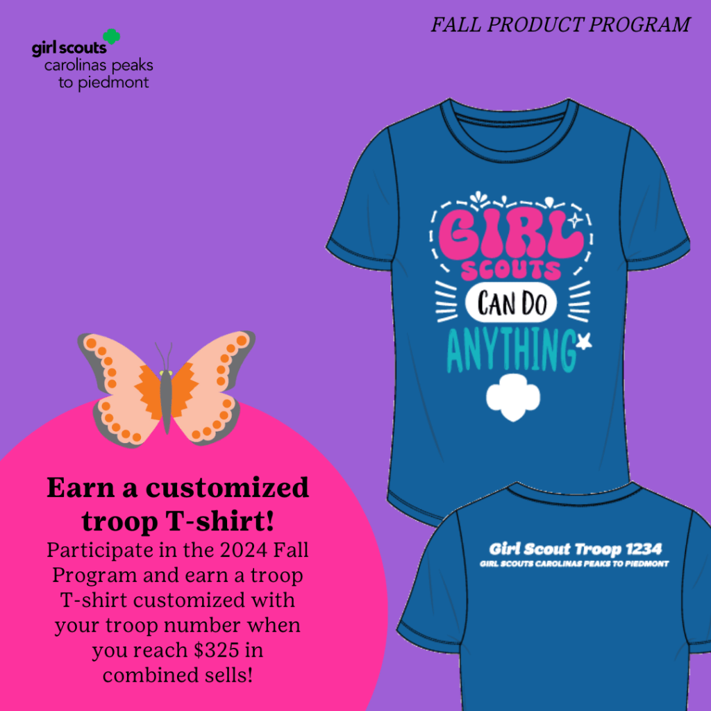 How close are you to earning your customized troop T-shirt? Reach $325 in combined sales to receive this custom swag and join in the fun of learning business skills while earning funds for amazing Girl Scout experiences this year! Learn more about our Fall Product Program and get started by creating your M2 account.