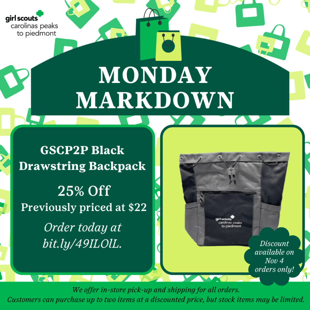 Enjoy a 25% off discount on our GSCP2P Black Drawstring Backpack today only! Order using the GSCP2P Shop Order Form for in-store pickup or to be delivered to your door.