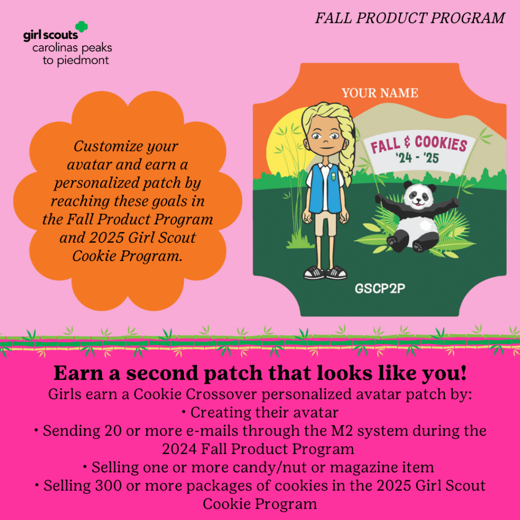 Did you know that you can earn TWO patches that look like you?Show off your avatar on a custom patch when you earn the Fall Product Patch. Then, continue working on your business skills and participate in our upcoming Girl Scout Cookie Program to earn the Cookie Crossover Patch! Avatar patches will be mailed directly to each girl who earns them at the end of each program. Girls should ensure their correct mailing address is reflected in the M2 system.