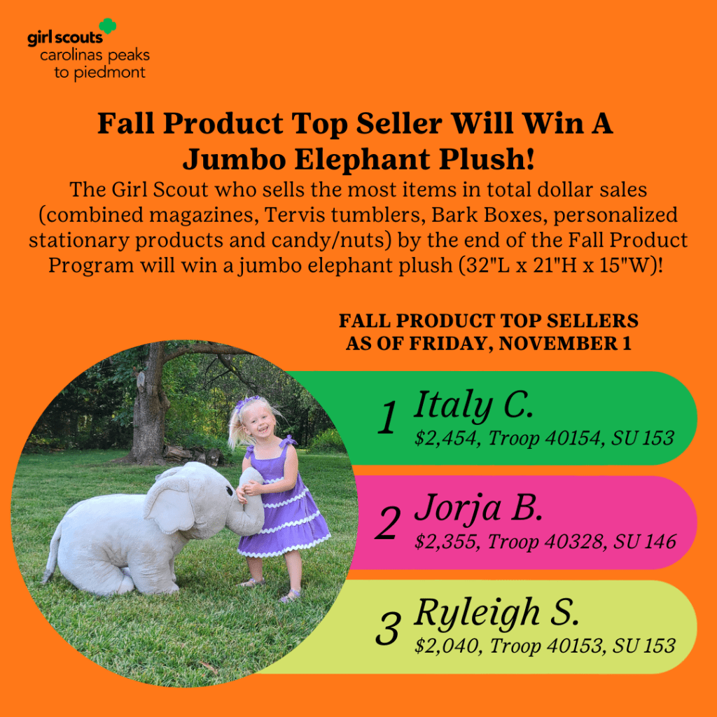 Congratulations to last week’s Fall Product Program top sellers! The Girl Scout who sells the most items in total dollar sales by the end of the program will win a jumbo elephant plush.