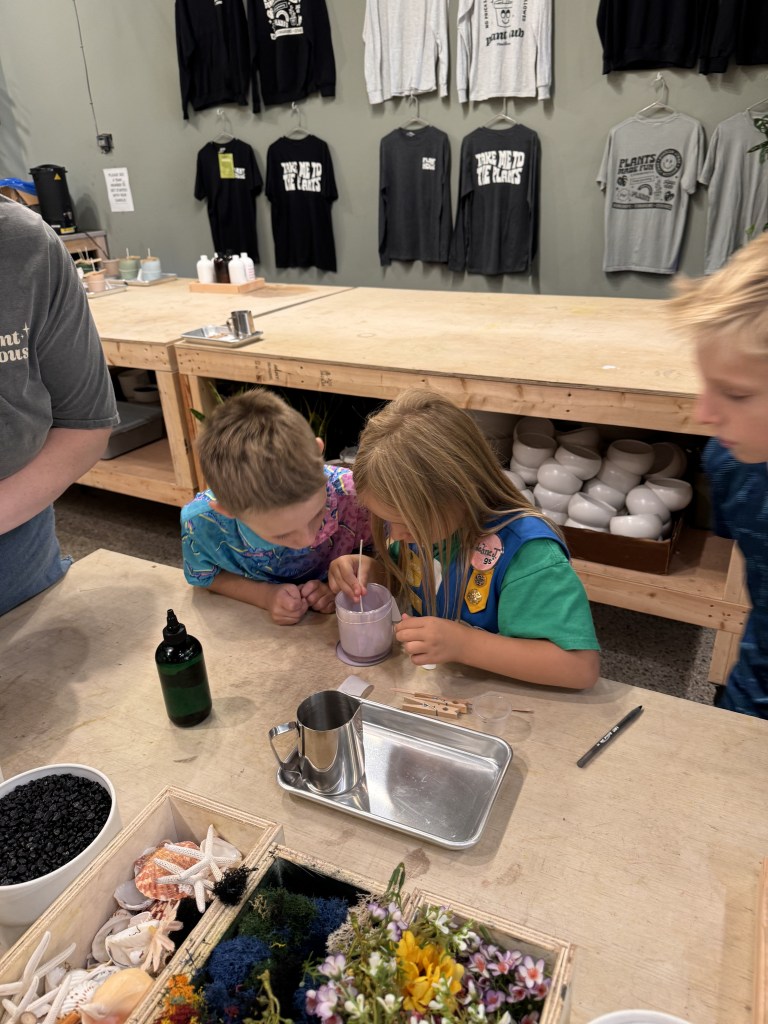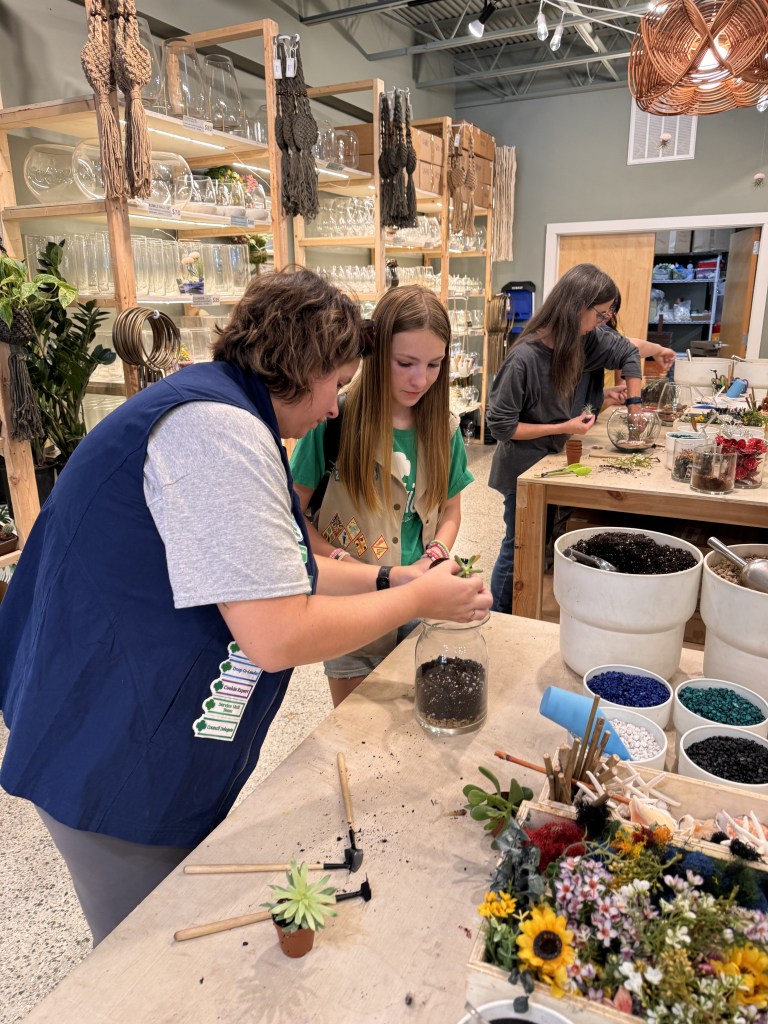“My sister and I took a trip up to Asheville, NC for a handmade candle or terrarium experience at the Plant House shop to sample some of the 2025 Girl Scout Cookie Program rewards. I chose to make a terrarium which was so much fun because you got to customize it however you wanted and add in all kinds of decorations. You got to choose from either succulents or air plants that you liked depending on your vessel size. I chose a glass container called a “milk jug” because it could fit up to three succulent plants. First when building the terrarium you add rocks in the bottom for drainage when water is added to your plants. Then you fill the glass halfway up with soil.”