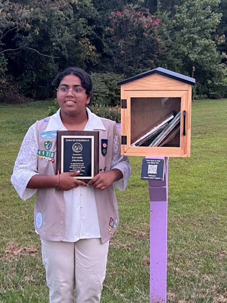 Kaveesha Abeykoon of Girl Scout Troop 41738 in Guilford County has earned the Girl Scout Gold Award for a community leadership and service project that addresses the issue of declining pollinator populations due to habitat loss and lack of awareness on their importance.