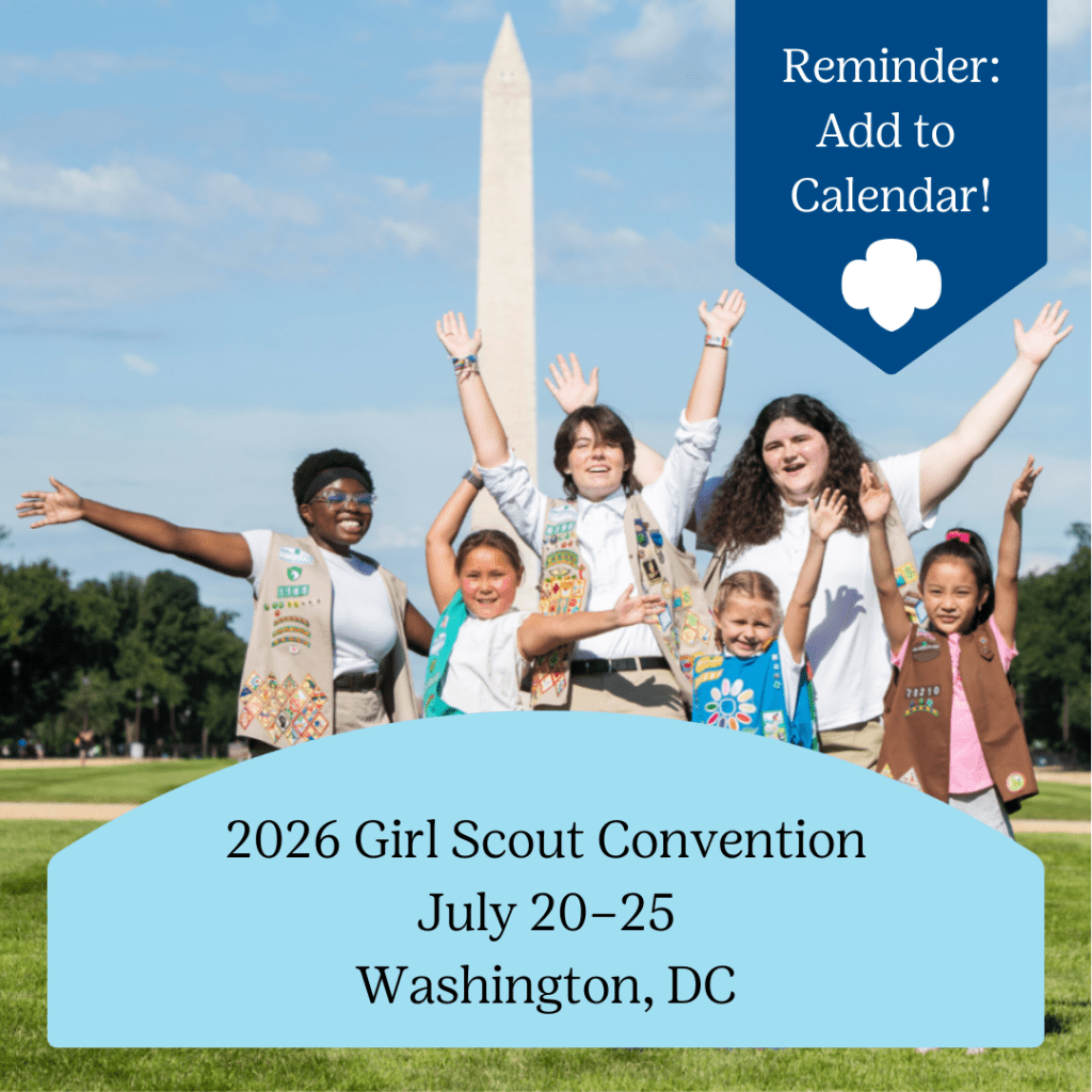 Want to see what girl-led looks like for our national organization? Is your troop ready for a travel experience? Save the date for the 2026 Girl Scout Convention happening in Washington D.C. next summer! This special six-day gathering only happens once every three years and kicks off with our 58th National Council Session (NCS) from July 20–22, where delegates from around the country and overseas gather to vote on and discuss issues important to our Movement, and elect leaders for the next triennium. After NCS, from July 23–25, thousands more Girl Scouts (and alums, families and non-members) stream into town for a multi-day event featuring interactive workshops, inspiring speakers and once-in-a- lifetime adventures that spark forever friendships. Save the date and stay tuned for more information.