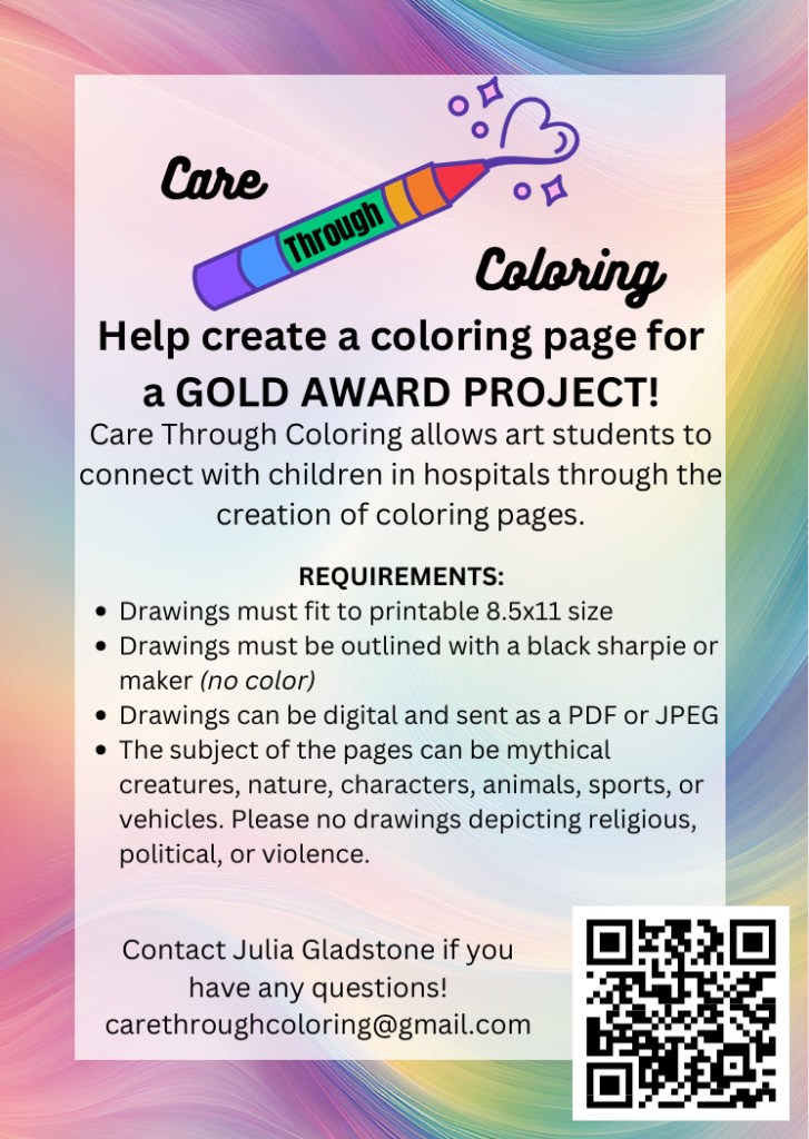 Aiming to address the importance of the arts and the need for calming activities in pediatric hospitals, the Girl Scout Ambassador focused on increasing accessibility for her project, “Care Through Coloring,” so more recreational therapists and art therapists have easy access to free coloring pages created by local high school art students.