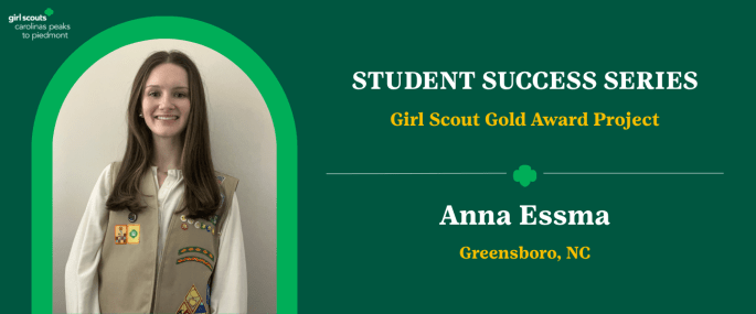 Anna Essma of Girl Scout Troop 2876 in Guilford County has earned the Girl Scout Gold Award for a community leadership and service project that prepares fifth grade students for middle school, teaching them organizational skills necessary for educational and future success. Aiming to address difficulty for adolescents transitioning from elementary school to middle school, … Continue reading Student Success Series: Anna Essma’s Girl Scout Gold Award Project”