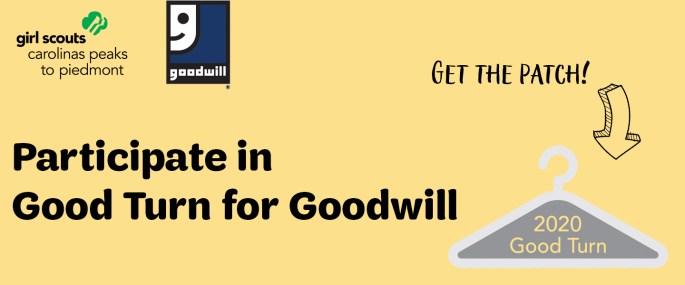 For the 19th year, Girl Scouts Carolinas Peaks to Piedmont and Goodwill Industries will once again partner together for their annual service project Good Turn for Goodwill. Running October 1-31, Girl Scouts are encouraged to collect bags of gently used clothing, electronics and household items to donate to their local Goodwill store. The collection of … Continue reading Good Turn for Goodwill 2020 Begins October 1!