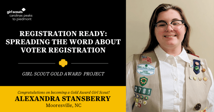 Alexandra Stansberry of Girl Scout Troop 2781 in Iredell County has earned the Girl Scout Gold Award for a community leadership and service project that addresses education for first-time voters on how to register and what is needed to vote locally. Aiming to fill the gap in resources to help people to vote in a … Continue reading Registration Ready: Spreading the Word About Voter Registration, Alexandra Stansberry’s Girl Scout Gold Award Project