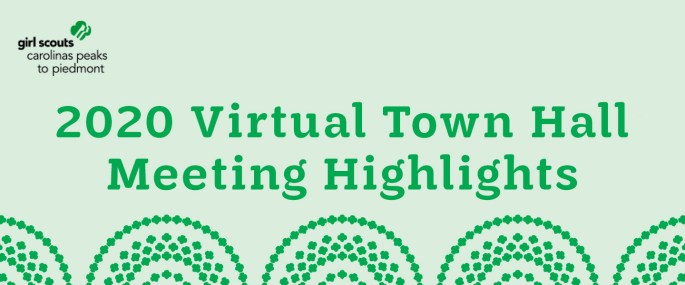 Every spring, Girl Scouts Carolinas Peaks to Piedmont (GSCP2P) celebrates it accomplishments and conducts council business during its Annual Meeting. This year, due to the current COVID19 pandemic, GSCP2P held a Virtual Town Hall Meeting in lieu of the in-person event. The event was held on Saturday, April 25 via Zoom. Registered voting participants of … Continue reading Virtual Town Hall Meeting Recap