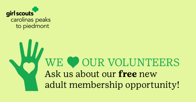 Thanks to a generous donation from our friends at Walmart and everyone who rounded up purchases during March 2021, our council is able to provide free adult memberships for all new troop leaders for the 2021-2022 troop year. How do you redeem this free adult membership? For new members: Go to http://www.BeAGirlScout.org, click Join Today, … Continue reading Free Membership Promotion
