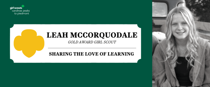 Girl Scouts Carolinas Peaks to Piedmont is pleased to announce that Leah McCorquodale, Kernersville, has earned her Girl Scout Gold Award, the highest achievement a Girl Scout can earn. McCorquodale, daughter of Tyler and Dona McCorquodale and a member of Girl Scout Troop 2419, created educational board games to donate to Guilford Elementary School. She … Continue reading Sharing the Love of Learning: A Girl Scout Gold Award Project