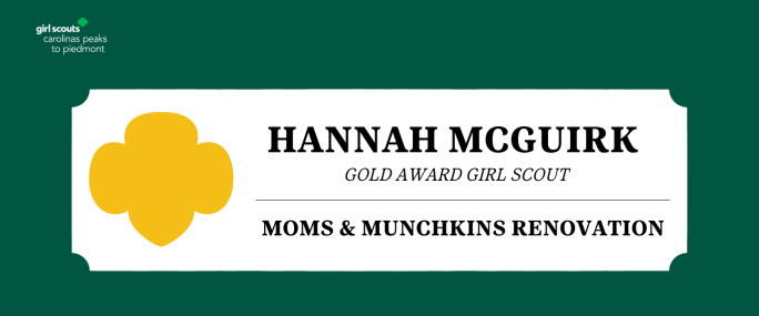 Girl Scouts Carolinas Peaks to Piedmont is pleased to announce that Hannah McGuirk, Denver, has earned her Girl Scout Gold Award, the highest achievement a Girl Scout can earn. McGuirk, a member of Girl Scout Troop 20436, partnered with Moms and Munchkins, a non-profit adolescent parenting program organization to renovate and repurpose a room at … Continue reading Moms & Munchkins Renovation: A Girl Scout Gold Award Project