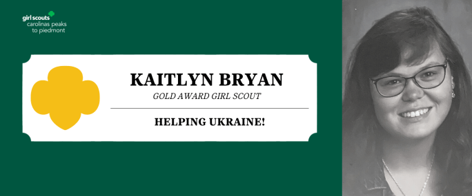 Girl Scouts Carolinas Peaks to Piedmont is pleased to announce that Kaitlyn Bryan, Clemmons, has earned her Girl Scout Gold Award, the highest achievement a Girl Scout can earn. Bryan, a member of Girl Scout Troop 2385, wanted to help displaced Ukrainians get the supplies they needed so she partnered with Trinity Church in Greensboro … Continue reading Helping Ukraine! A Girl Scout Gold Award Project