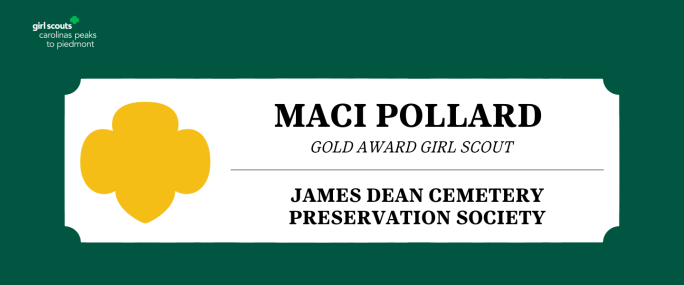 Girl Scouts Carolinas Peaks to Piedmont is pleased to announce that Maci Pollard, Connelly Springs, has earned her Girl Scout Gold Award, the highest achievement a Girl Scout can earn. Pollard, a member of Girl Scout Troop 2396, helped restore and repair the headstones and revitalize the columbarium area at Quaker Meadows Presbyterian Church in … Continue reading James Dean Cemetery Preservation Society: A Girl Scout Gold Award Project