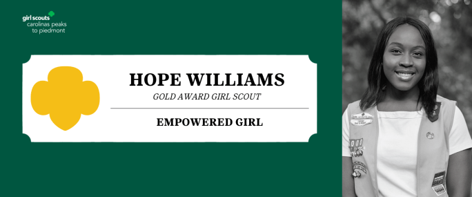 Girl Scouts Carolinas Peaks to Piedmont is pleased to announce that Hope Williams, Reidsville, has earned her Girl Scout Gold Award, the highest achievement a Girl Scout can earn. Williams, daughter of Demond and Terrica Williams and a member of Girl Scout Troop 30000, created an “Empowered Girl” program as a resource for high school … Continue reading Empowered Girl: A Girl Scout Gold Award Project