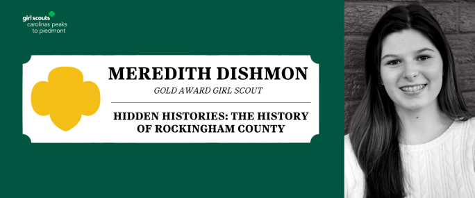 Girl Scouts Carolinas Peaks to Piedmont is pleased to announce that Meredith Dishmon, Reidsville, has earned her Girl Scout Gold Award, the highest achievement a Girl Scout can earn. Dishmon, a member of Girl Scout Troop 3000, addressed the lack of resources concerning local history by creating a website and webquest to be used by … Continue reading Hidden Histories: The History of Rockingham County – A Girl Scout Gold Award Project