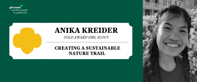 Girl Scouts Carolinas Peaks to Piedmont is pleased to announce that Anika Kreider, Mebane, has earned her Girl Scout Gold Award, the highest achievement a Girl Scout can earn. Kreider, daughter of Jason and Christine Kreider and a member of Girl Scout Troop 2188, revitalized a neglected trail for a local elementary school that had … Continue reading Creating a sustainable Nature Trail: A Girl Scout Gold Award Project