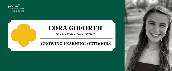 Girl Scouts Carolinas Peaks to Piedmont is pleased to announce that Cora Goforth, Forest City, has earned her Girl Scout Gold Award, the highest achievement a Girl Scout can earn. Goforth, a member of Girl Scout Troop 1853, constructed and installed an outdoor classroom at Forrest Hunt Elementary School. She equipped the new classroom with … Continue reading Growing Learning Outdoors: A Girl Scout Gold Award Project