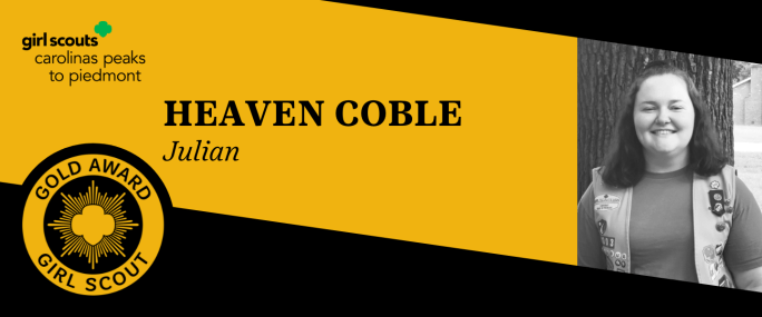 Girl Scouts Carolinas Peaks to Piedmont is pleased to announce that Heaven Coble, Julian, has earned her Girl Scout Gold Award, the highest award in Girl Scouting. Coble, a member of Girl Scout Troop 40003 and daughter of Malissia Manning, built learning gardens for Nathanael Greene Elementary School and a gaga ball pit for Mt. … Continue reading Heaven Coble Earns Girl Scouts’ Highest Honor