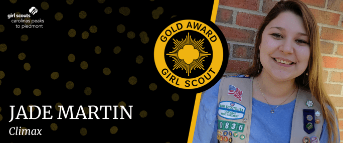 Girl Scouts Carolinas Peaks to Piedmont is pleased to announce that Jade Martin, Climax, has earned her Girl Scout Gold Award, the highest award in Girl Scouting. Martin, daughter of Shane and Melissa Wolfe and a member of Girl Scout Troop 40836, built several bat boxes to donate to local farms, families and neighbors. Along … Continue reading Jade Martin Earns Girl Scouts Highest Honor