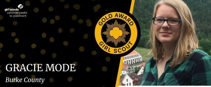 Girl Scouts Carolinas Peaks to Piedmont is pleased to announce that Gracie Mode, Morganton, has earned her Girl Scout Gold Award, the highest award in Girl Scouting. Mode, daughter of William and Tara Mode and a member of Girl Scout Troop 10383, worked with The Meeting Place, a local women and children’s homeless shelter, to … Continue reading Gracie Mode Earns Girl Scouts Highest Honor