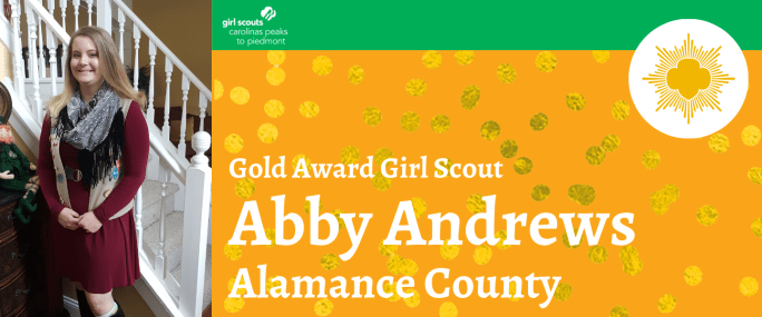 Girl Scouts Carolinas Peaks to Piedmont is pleased to announce that Abby Andrews, Graham, has earned her Girl Scout Gold Award, the highest award in Girl Scouting. Andrews, daughter of John and Terri Andrews and a member of Girl Scout Troop 41785, organized an adoption fair for shelter dogs and raised awareness for dogs that … Continue reading Abby Andrews Earns Girl Scouts Highest Honor