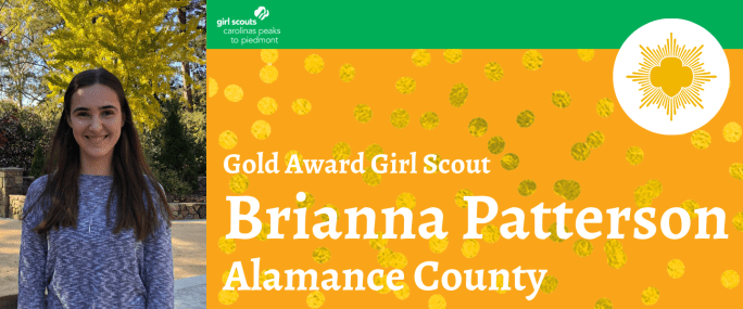 Girl Scouts Carolinas Peaks to Piedmont is pleased to announce that Brianna Patterson, Mebane, has earned her Girl Scout Gold Award, the highest award in Girl Scouting. Patterson, daughter of Ryan and Lynn Patterson and a member of Girl Scout Troop 13002, created a website for children around the world to access free books to … Continue reading Brianna Patterson Earns Girl Scouts Highest Honor