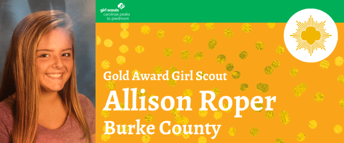 Girl Scouts Carolinas Peaks to Piedmont is pleased to announce that Allison Roper, Morganton, has earned her Girl Scout Gold Award, the highest award in Girl Scouting. Roper, daughter of Daniel and Amanda Roper and a member of Girl Scout Troop 10383, raised funds and awareness to give residents with intellectual and developmental disabilities at … Continue reading Allison Roper Earns Girl Scouts Highest Honor