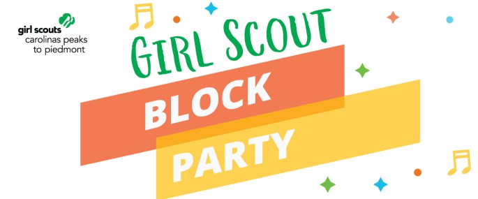 We hope you'll join us to celebrate Girl Scout Week! Girl Scout Block Parties are happening at all four service centers and shops on Saturday, March 14. The Asheville, Gastonia and Triad Block Party is 10 a.m.- 2 p.m. (shops also open 10 a.m.- 2 p.m.) and the Hickory Block Party is 1-4 p.m. (shop … Continue reading Girl Scout Block Parties Planned for March 14