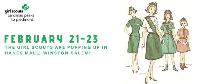 In honor of National Girl Scout Cookie Weekend, Girl Scouts will be hosting Girl Scout cookie booths and a pop-up shop (complete with fun activities for all ages) at Hanes Mall in Winston-Salem on February 21-23. In addition to selling their famous cookies, Girl Scouts will also sell Girl Scout gear and merchandise and provide … Continue reading Girl Scouts Bring Cookies and Fun to Hanes Mall for National Girl Scout Cookie Weekend